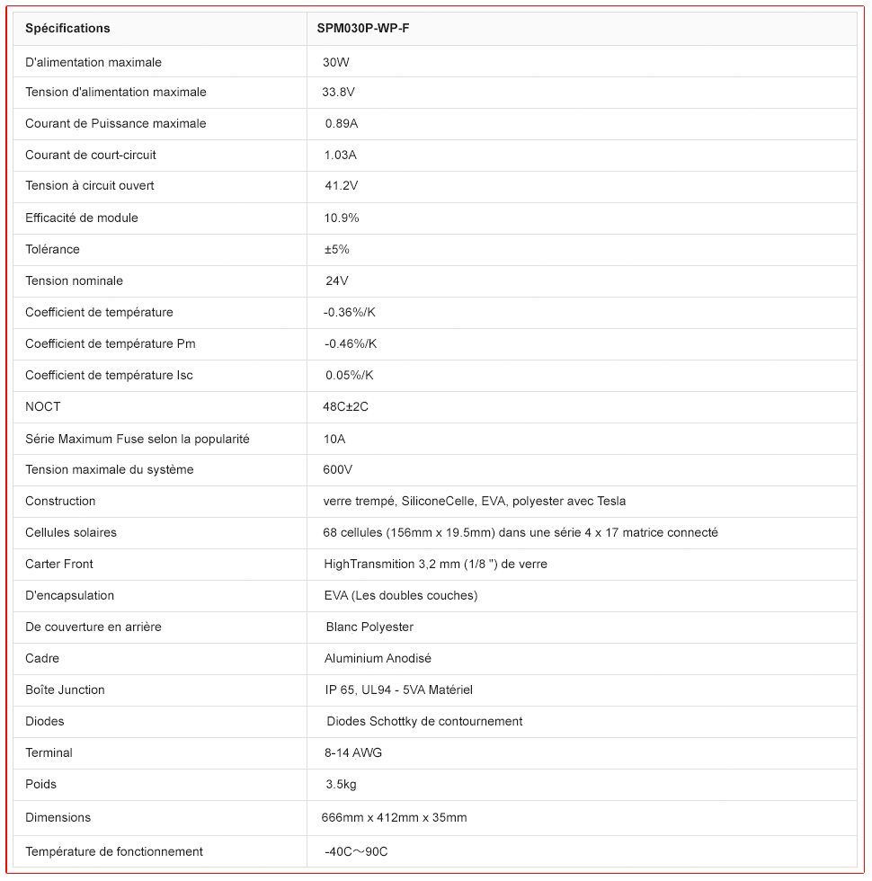 (EVA) avec TPT amortit les cellules solaires à l'intérieur du stratifié et assure les caractéristiques de fonctionnement des piles solaires sous climatique pratiquement toutes les conditions. Cadre rigide en aluminium anodisé et verre à faible fer tempéré.