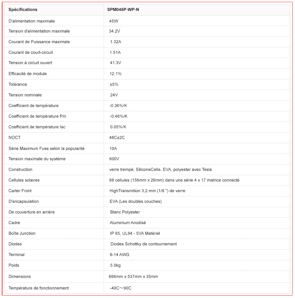 (EVA) avec TPT amortit les cellules solaires à l'intérieur du stratifié et assure les caractéristiques de fonctionnement des piles solaires sous climatique pratiquement toutes les conditions.Cadre rigide en aluminium anodisé et verre à faible fer trempé.
