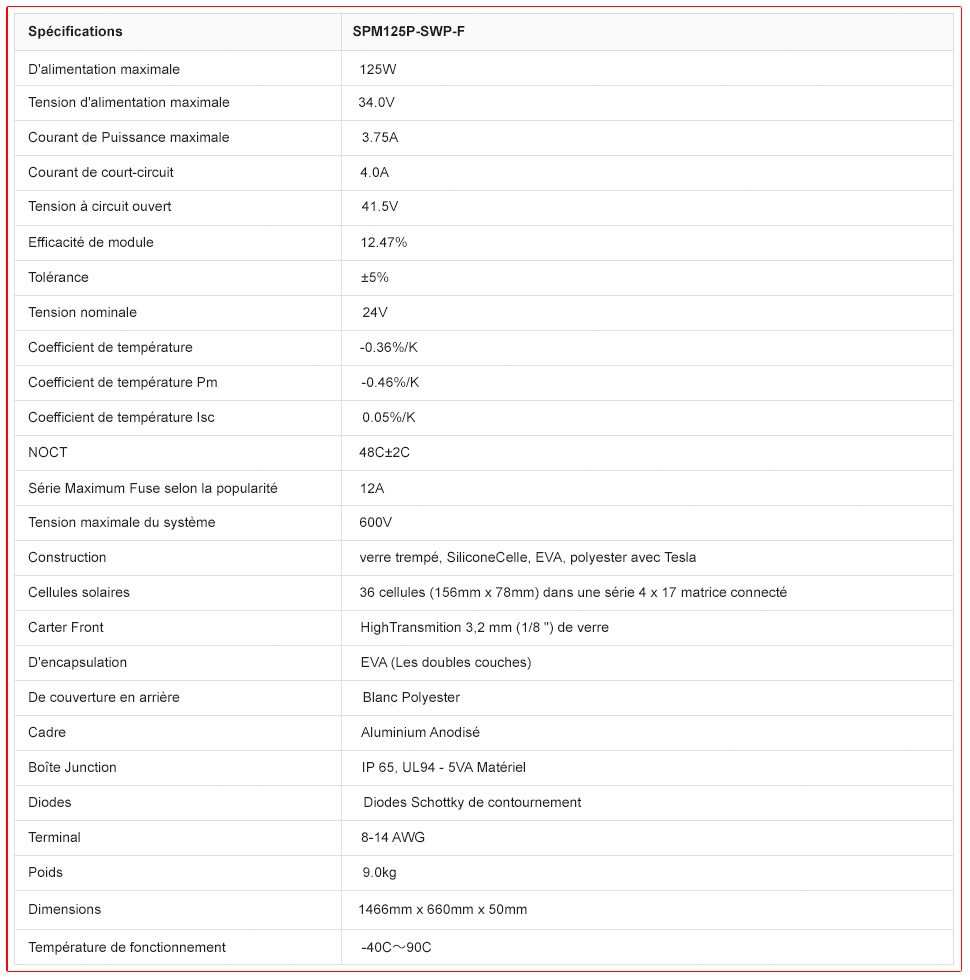 (EVA) avec TPT amortit les cellules solaires à l'intérieur du stratifié et assure les caractéristiques de fonctionnement des piles solaires sous climatique pratiquement toutes les conditions. Cadre rigide en aluminium anodisé et verre à faible fer tempéré.